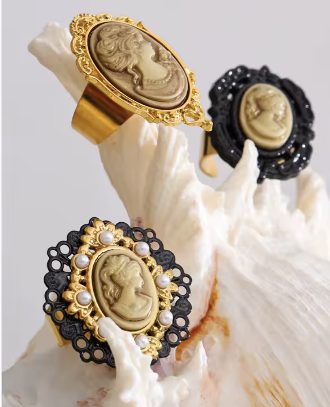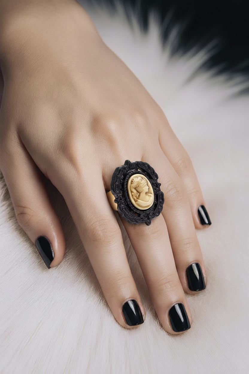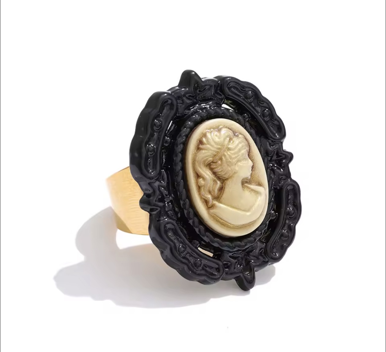 Μεγαλο δαχτυλιδι καμεο μαυρο ,απο ατσαλι επιχρυσωμενο. ανοιγομενο απο 8 εως 10 νουμερο