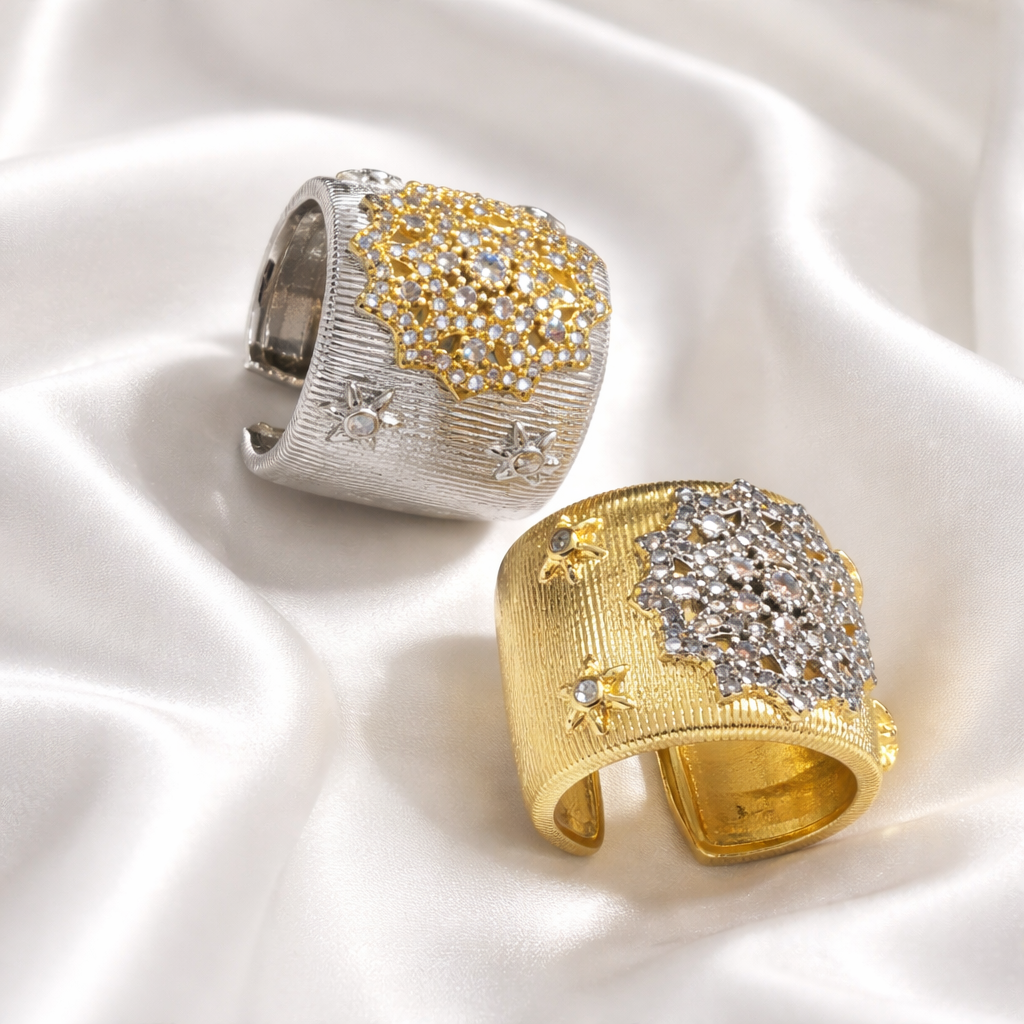 Δαχτυλιδι φαρδυ ματ ασημι με λεπτομερεια χρυση και καρφωτα ζιργκον. καλυπτει απο 7 εως 9 νουμερο και ειναι ανοιγομενο.
