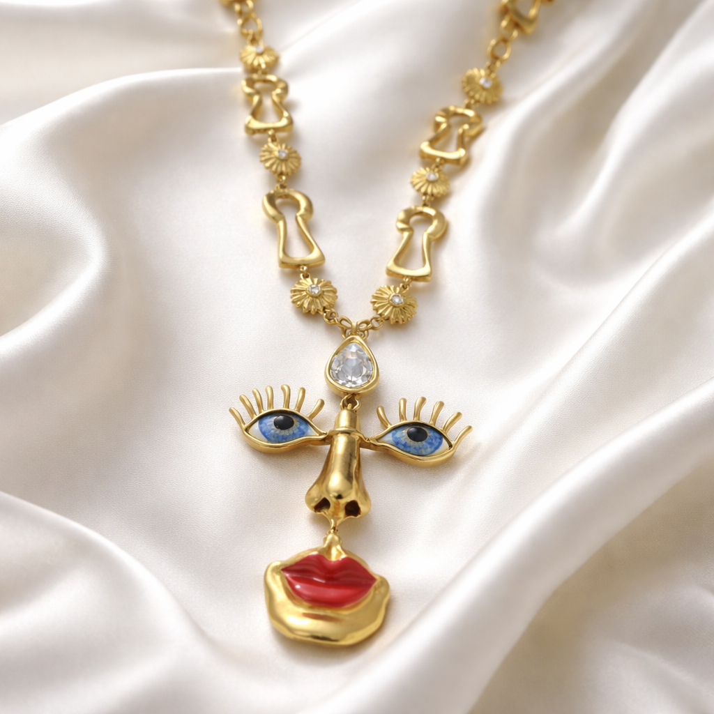 Κολιε μακρια χρυση ματ αλυσιδα με προσωπο και κοκκινη χειλη στο τελειωμα.