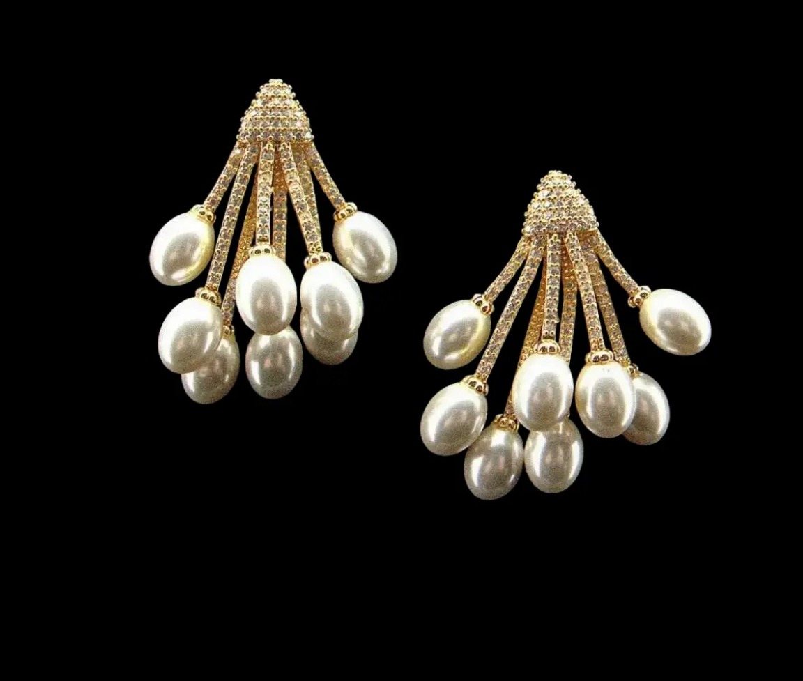 Σκουλαρίκια κολλητά από ατσάλι επιχρυσωμένο με καρφωτή ζιργκον και πέρλες στο τελείωμα. μήκος 3 εκατοστά